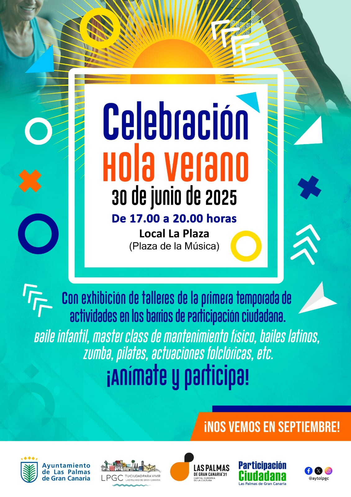 Desde la concejalía delegada de Participación Ciudadana, les informamos que el próximo lunes 30 de junio en horario de 17:00 a 20:00 horas, en el local La Plaza (Plaza de la Música), realizaremos la actividad "Hola Verano", donde habrá una exhibición de los diferentes talleres que se han realizado por Participación Ciudadana en los barrios de la ciudad. Contaremos con actividades como baile infantil, master class de mantenimiento físico, bailes latinos, zumba, pilates, actuaciones folclóricas y algunas sorpresas más.